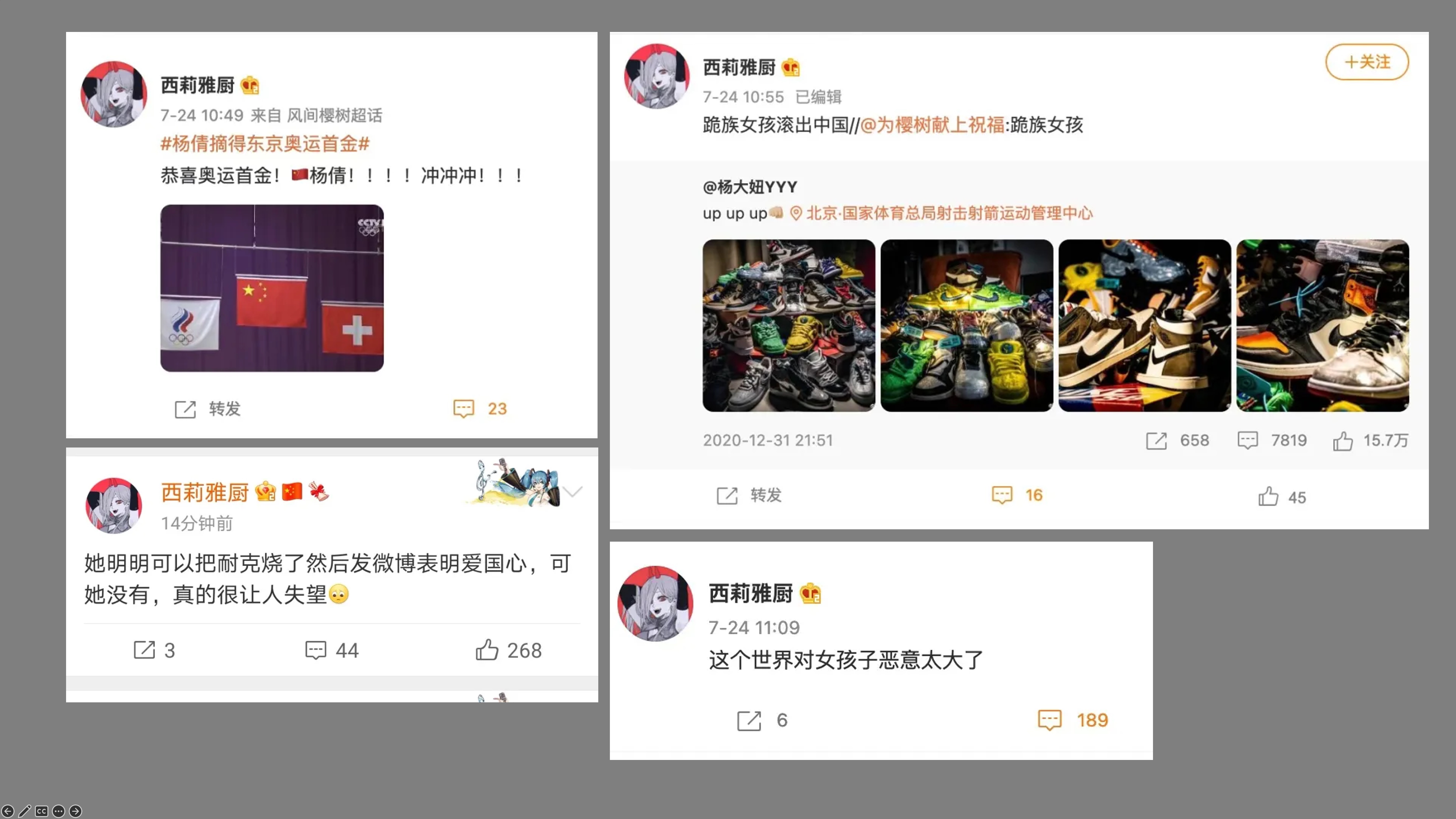 Then people found Yang's collection of Nike shoes, comments changed from "China's pride" to "kneeling girl get out of China" within a few minutes. Later, the person who led the attack on Yang Qian for being unpatriotic was scolded, and then posted "The world is too malicious to girls."