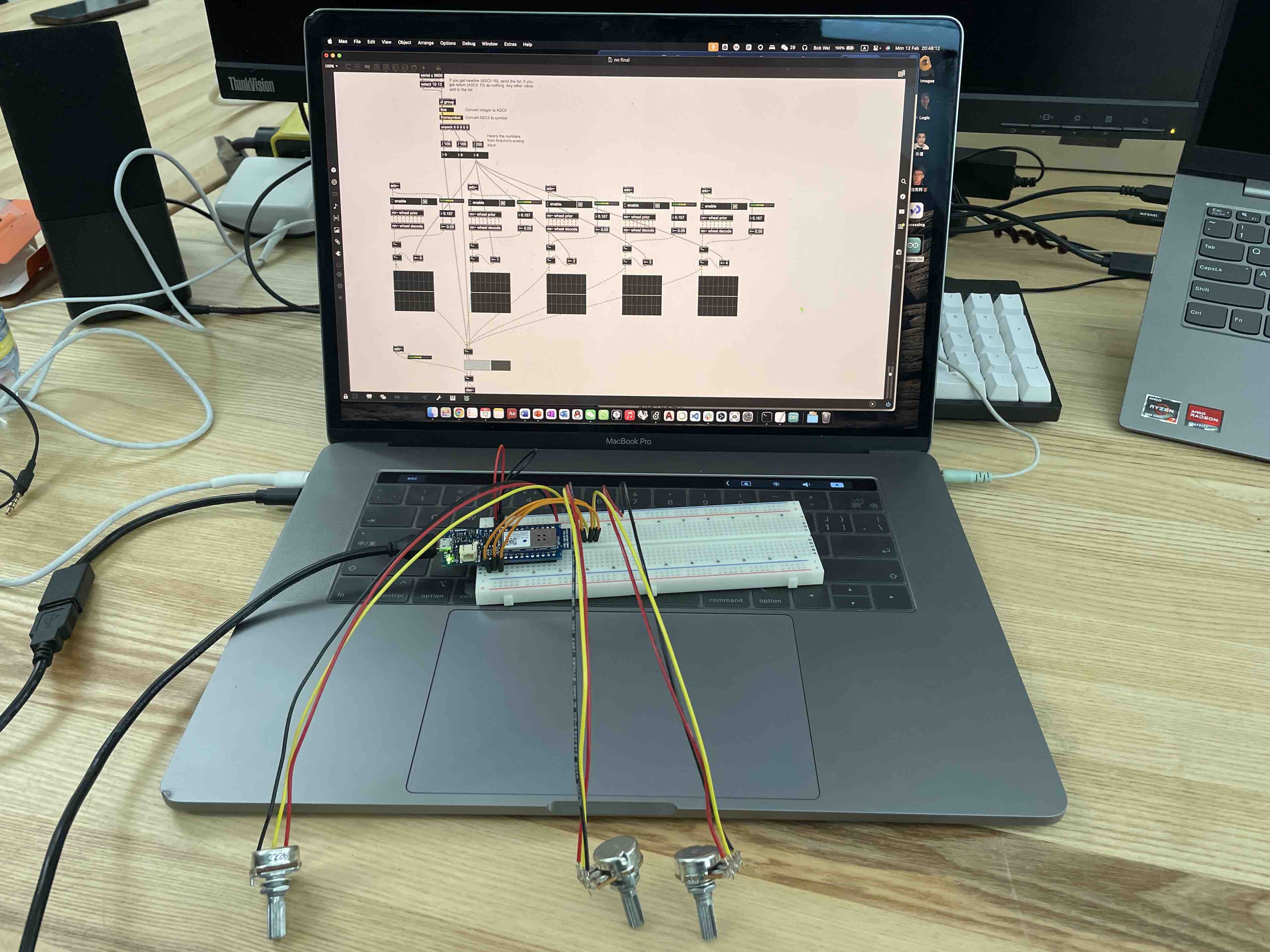 Ultimately I decided to make this guitaramplifier capable of running neural network models used to process sound. Iused an external called nn~ on the max for running the modellocally in real time to process sounds. Here I used a model called wheel thatrecognizes the sounds and describes them in text, and the described text I readthem out immediately using machine speech. Interestingly, what they read aloudis not even a language, I processed it as a sound effect.