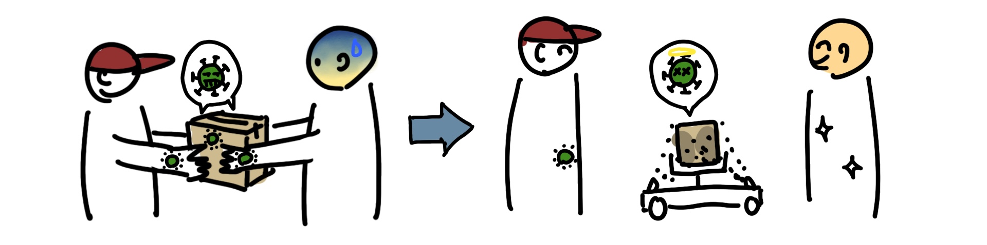 When we pick up a parcel, our hands come into direct contact with the courier's hands or the parcel, which leads to a high risk of exposure to the virus. When disinfecting manually, the skin still comes in contact with the parcels and there is still a risk of incomplete disinfection.